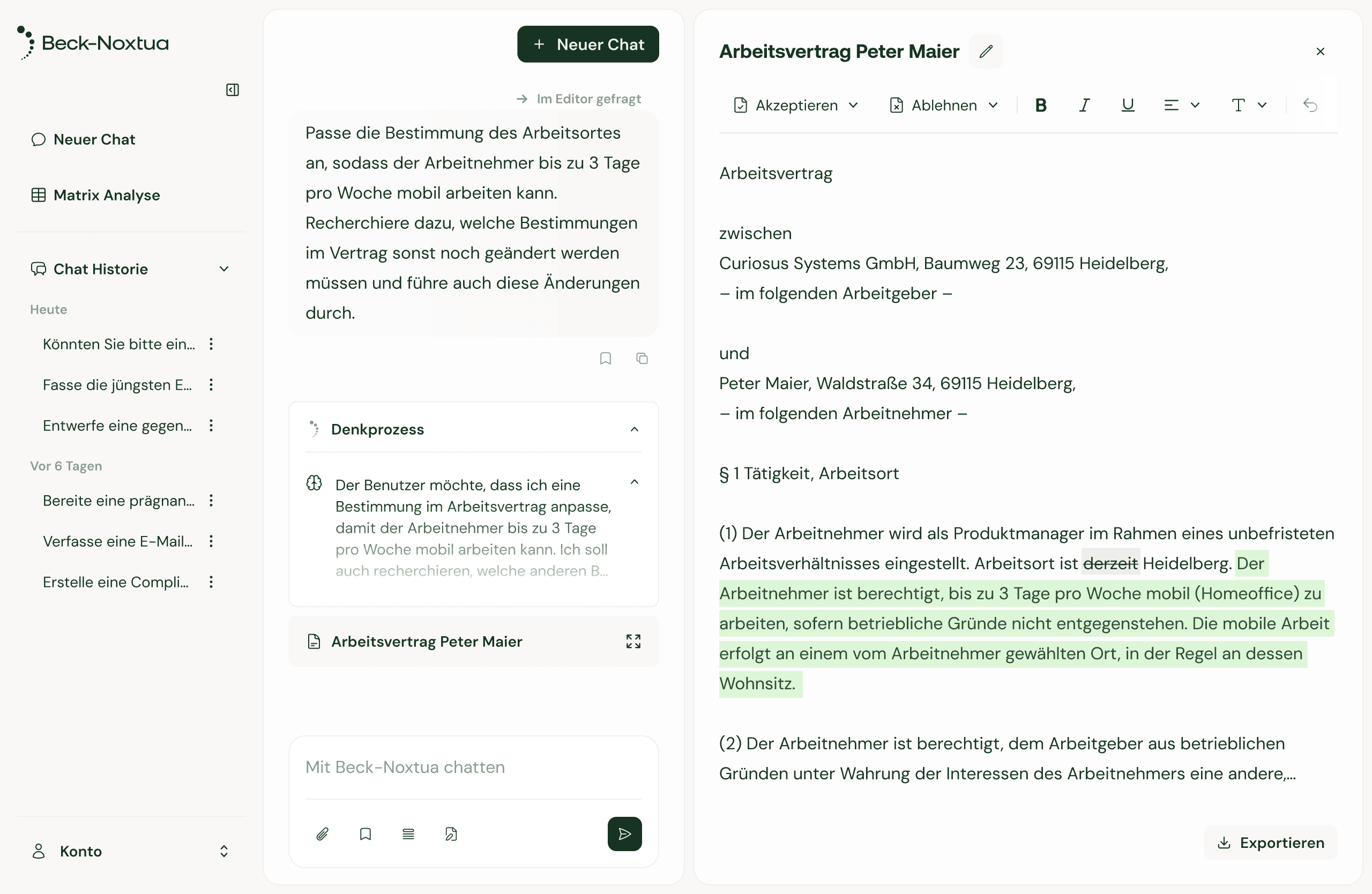 Nachdem Sie alle relevanten Informationen erhalten haben, öffnen Sie den Editor. Beauftragen Sie Beck-Noxtua im Chat mit der Erstellung eines strukturierten Memorandums zu Ihren Rechercheergebnissen. Die KI analysiert die vorherige Recherche und erstellt einen ersten Entwurf im Editor.