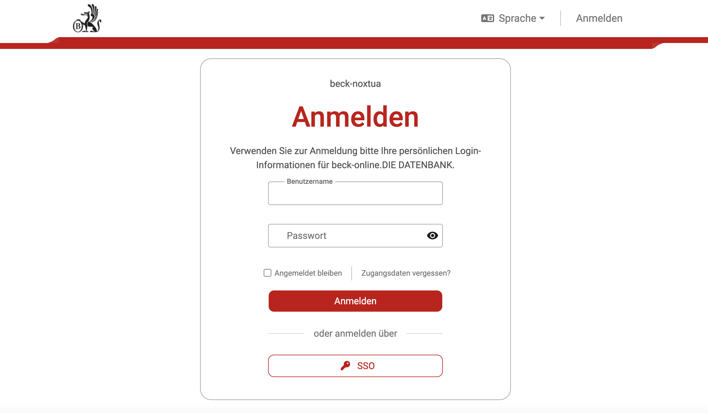 Beck-Noxtua bietet eine Single-Sign-On (SSO) Anmeldung über beck-online an. Nutzer*innen greifen mit ihren bestehenden beck-online Zugangsdaten auf Beck-Noxtua zu. Separate Passwörter oder Tenant-IDs werden nicht mehr benötigt. Rollen und Berechtigungen werden automatisch übernommen und basieren vollständig auf der beck-online Lizenzverwaltung.