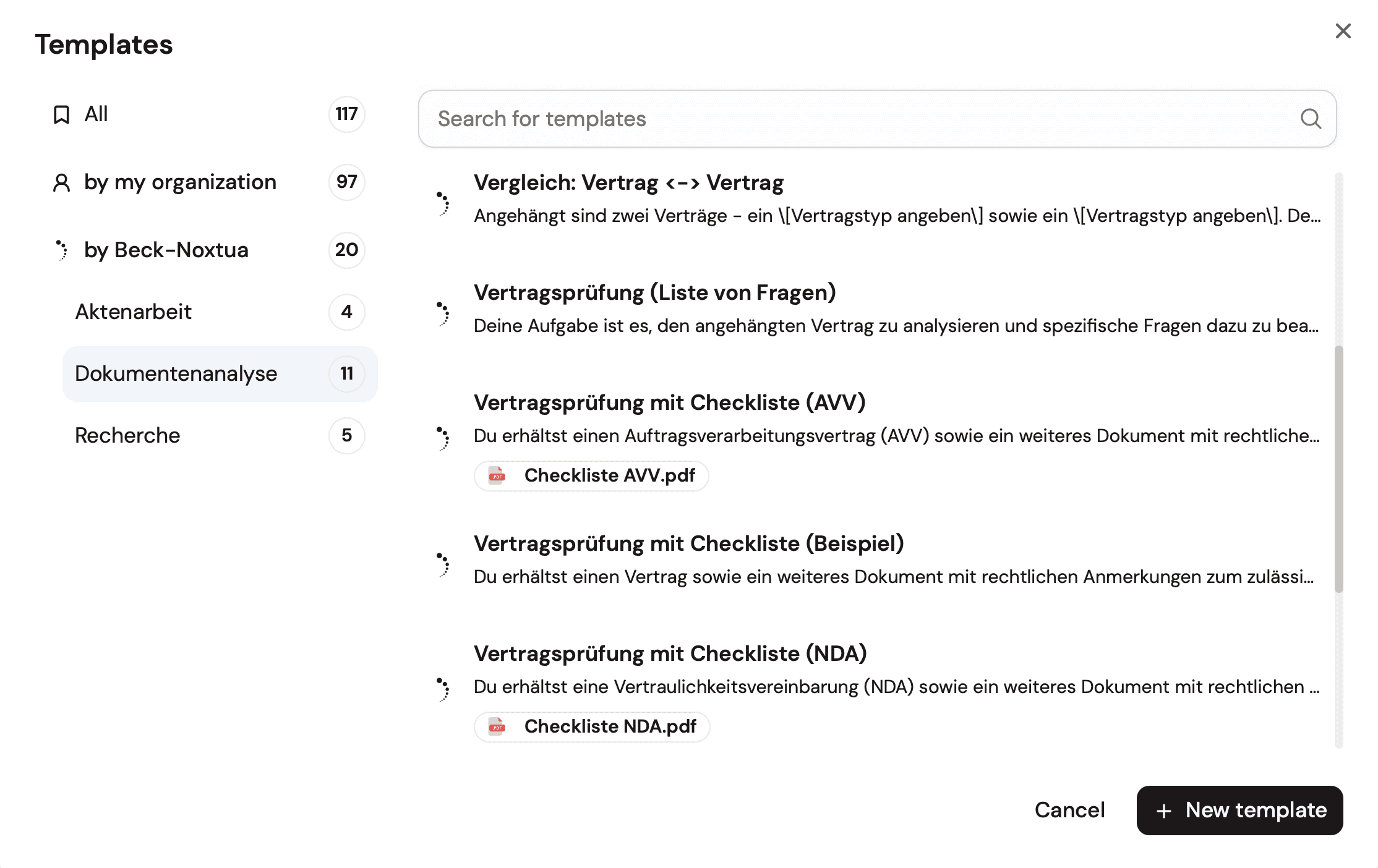 Templates are prompt presets you can use straight away to complete recurring legal tasks. In addition to creating your own templates within your organisation, Noxtua provides you with predefined templates developed and tested in practice by legal experts.