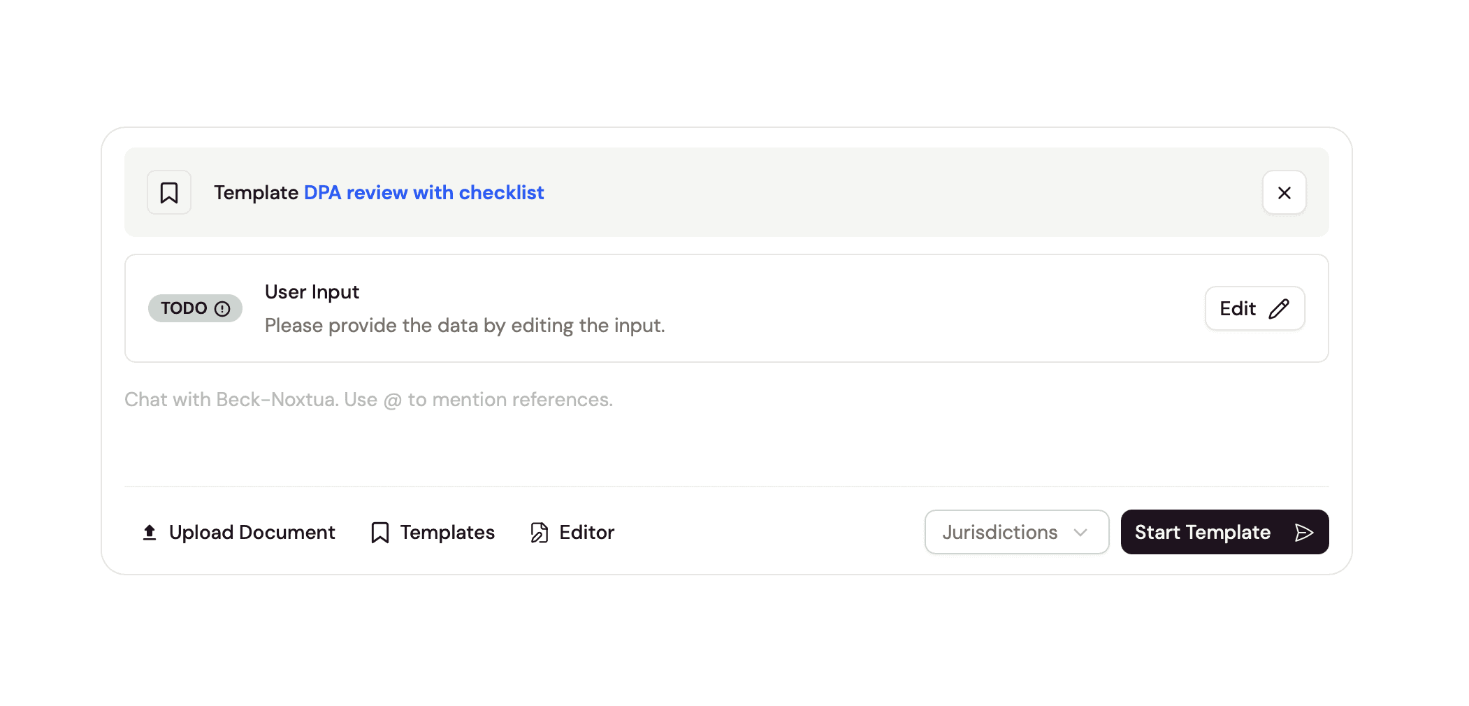 If the template requires specific information or documents from you, you'll see a box marked "Todo" below the template. Click "Edit" and a window opens prompting you to provide the required inputs, either as text entries or uploaded documents. Once you've provided all inputs, Noxtua inserts them directly into the template to complete it for your specific use case.
