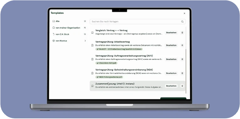 Templates helfen Ihnen, wiederkehrende juristische Aufgaben mithilfe von abgespeicherten Prompts zu automatisieren. In diesem Video erfahren Sie, wie Sie einmal ein Template erstellen und es dann immer wieder nutzen – für schnellere Ergebnisse und konstante Qualität im ganzen Team.