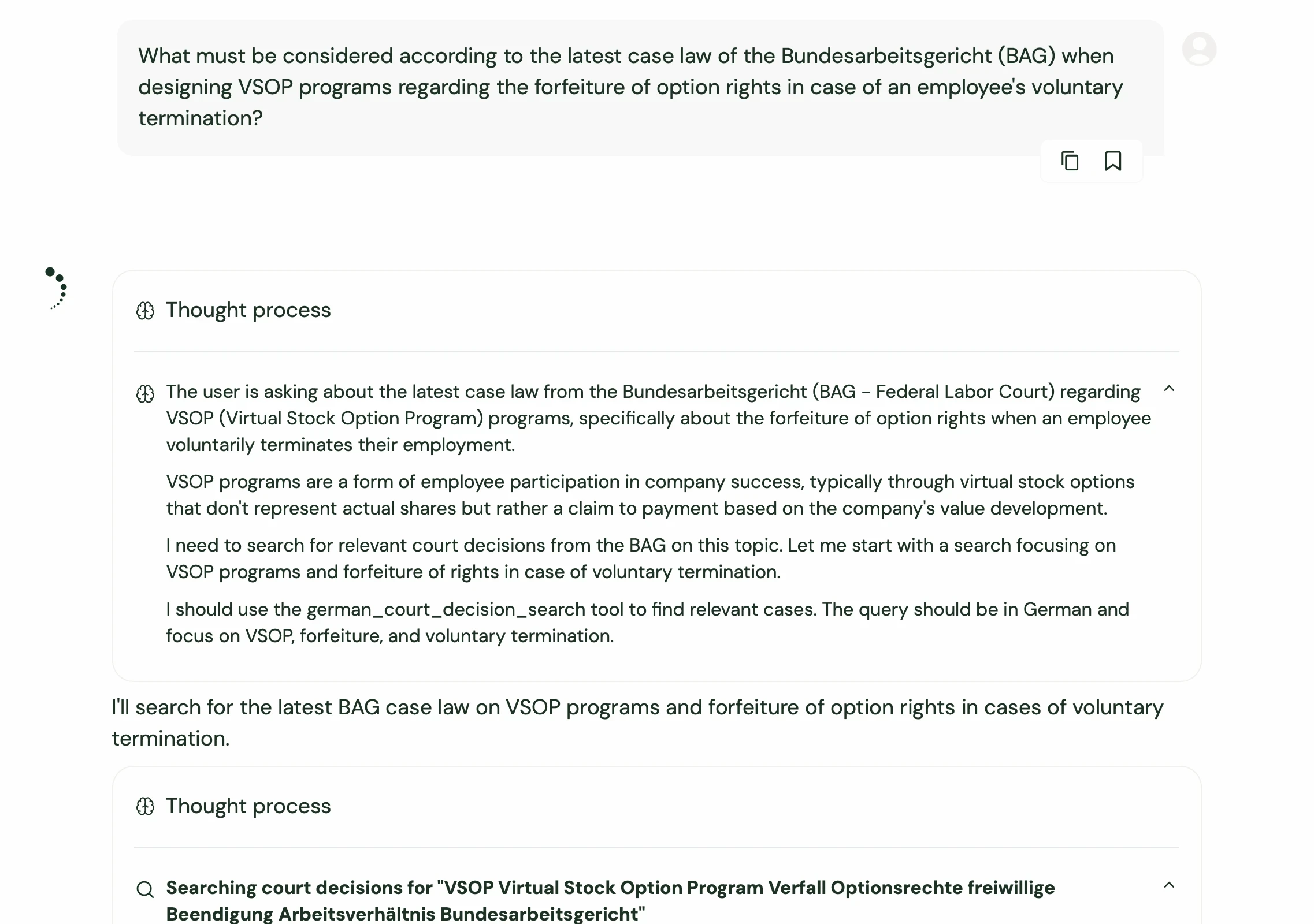 Better answer quality: Through systematic planning and specialized research capabilities for legal literature, you'll get better structured and comprehensively researched results.