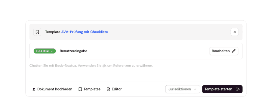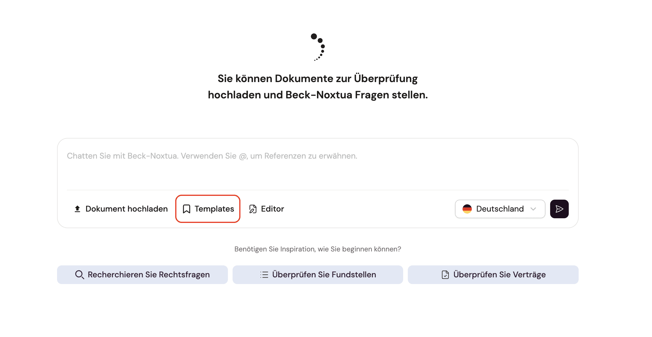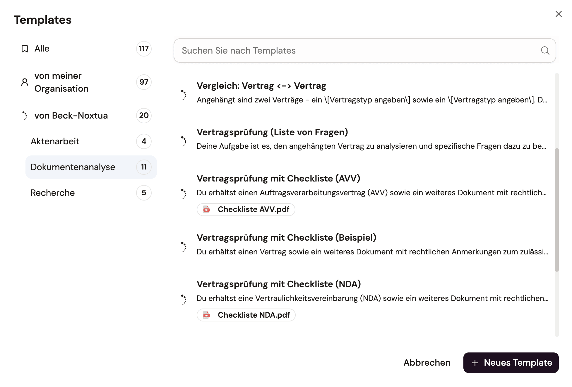 Templates sind Prompt-Vorlagen, die Sie sofort verwenden können, um wiederkehrende Aufgaben zügig zu erledigen. Neben der Möglichkeit, eigene Templates innerhalb Ihrer Organisation zu erstellen, stellt Beck-Noxtua Ihnen vordefinierte Templates zur Verfügung, die von Rechtsexpert*innen entwickelt und in der Praxis erprobt wurden.