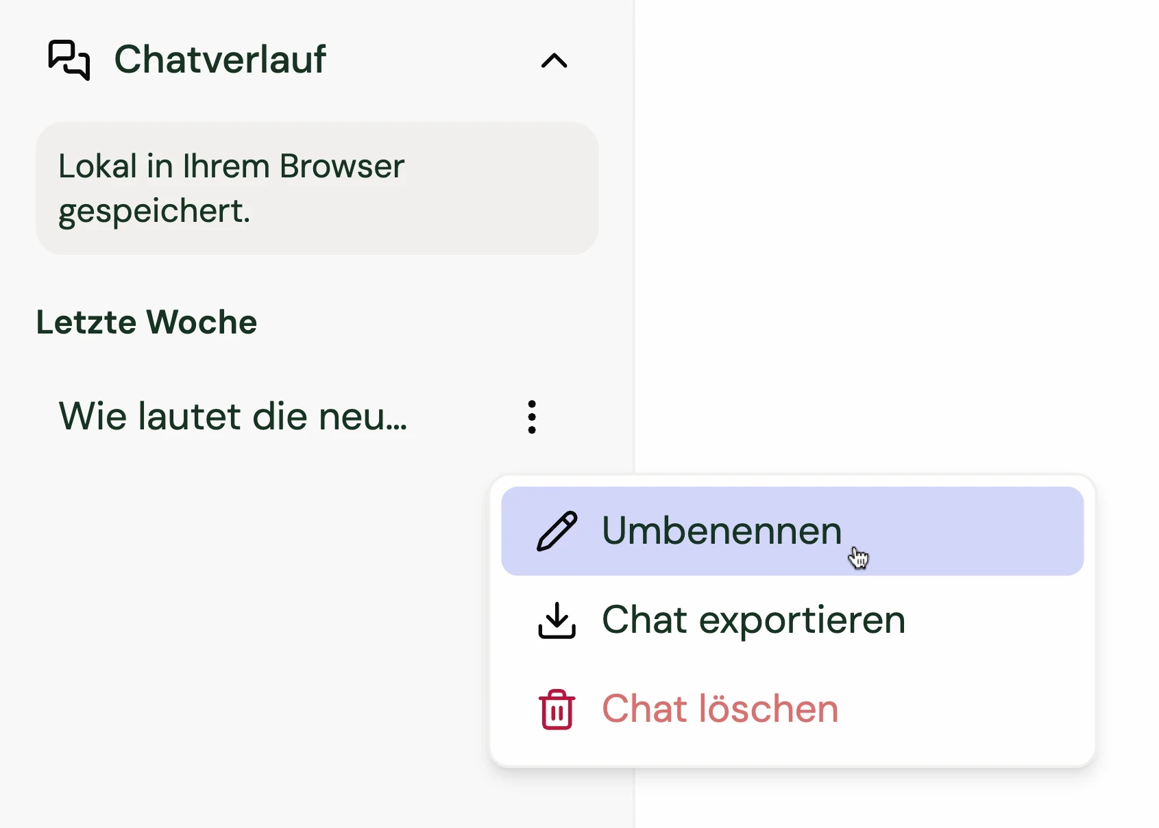 Klicken Sie einfach auf die drei Punkte neben einem Chat-Titel, wählen Sie „Umbenennen" und geben Sie Ihrem Chat einen aussagekräftigen Namen. So bleibt Ihr Arbeitsbereich organisiert und Sie finden vergangene Chats und Ergebnisse schneller wieder.