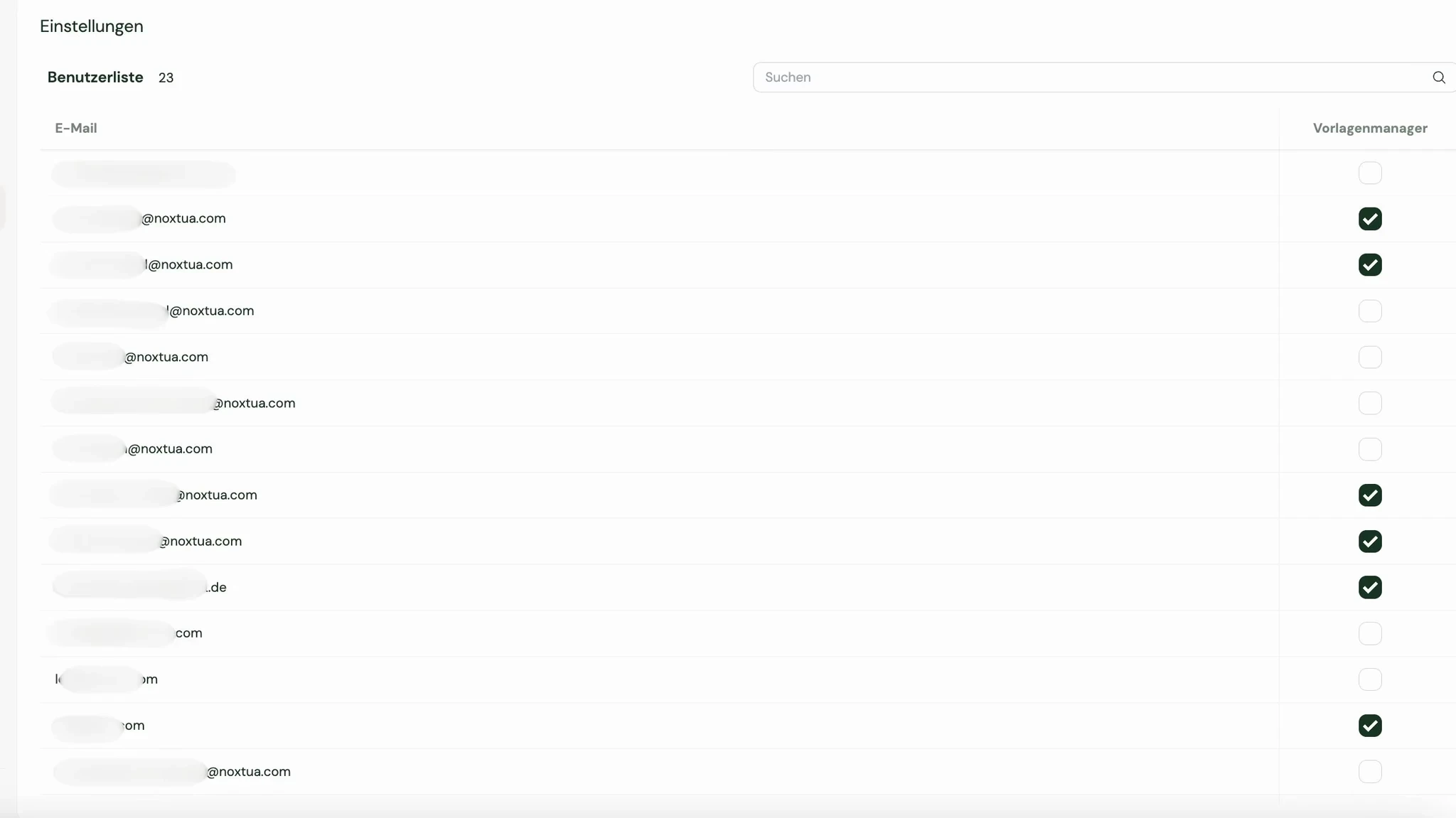 In den Einstellungen finden Sie die Rollenverwaltung. Aktivieren Sie die Vorlagenmanagerrollen, indem Sie das entsprechende Kästchen (Quadrat) neben der E-Mail-Adresse Ihres Kollegen markieren.