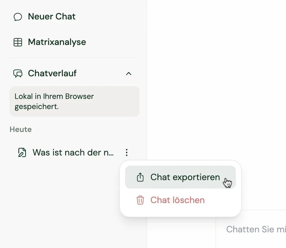 Ihre gesamte Konversation mit Beck-Noxtua lässt sich ganz einfach sichern, denn Ihre Chat-Verläufe werden lokal im Browser gespeichert. Öffnen Sie zunächst den gewünschten Chat in Ihrer Historie und klicken Sie rechts auf das Menü-Symbol (⋮). Wählen Sie anschließend „Chat exportieren“. Der Chat wird als Word-Dokument exportiert, das sowohl Ihre Eingaben (Prompts) als auch die Antworten von Beck-Noxtua enthält, und direkt in Ihrem Download-Ordner abgelegt.