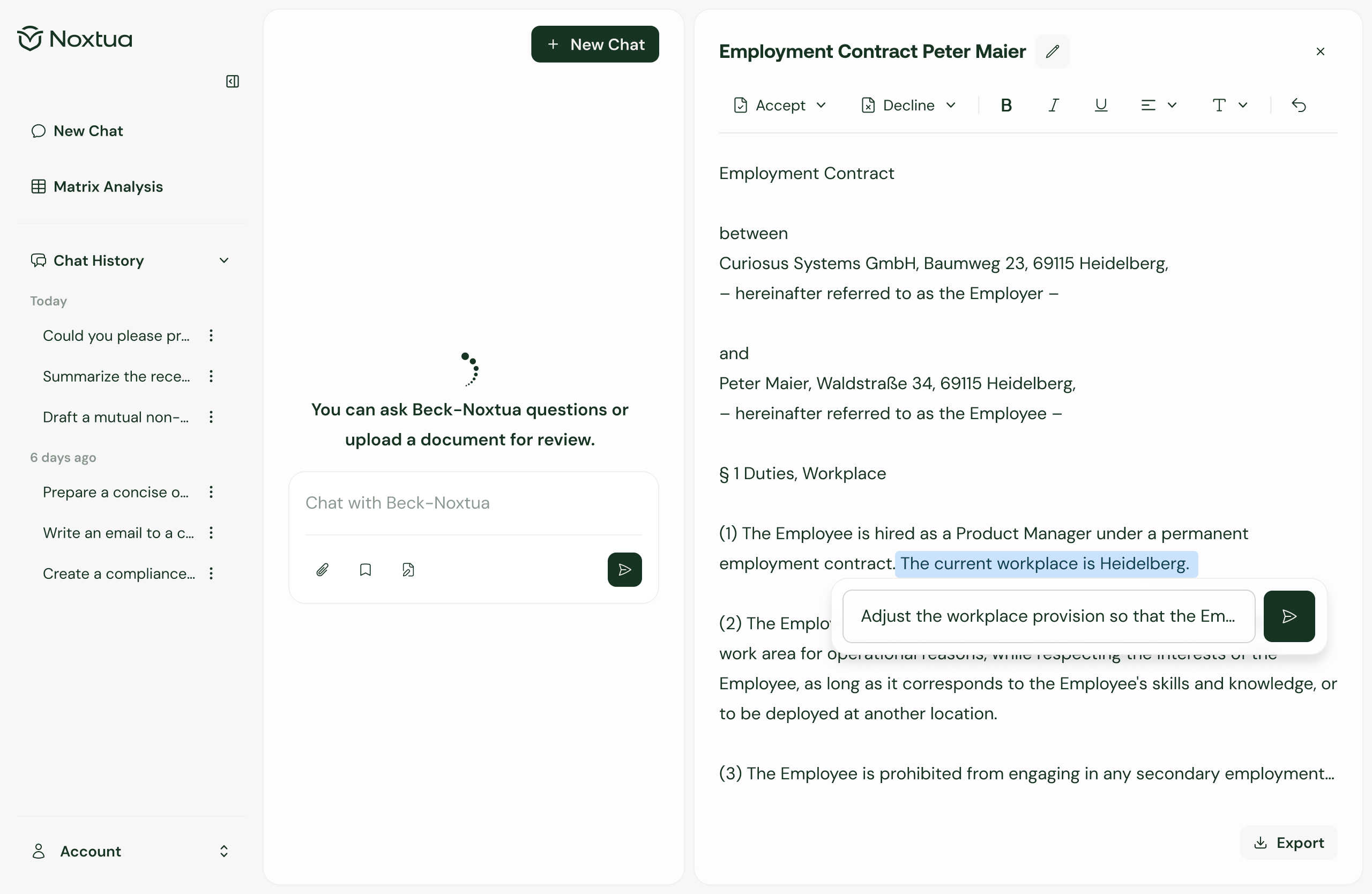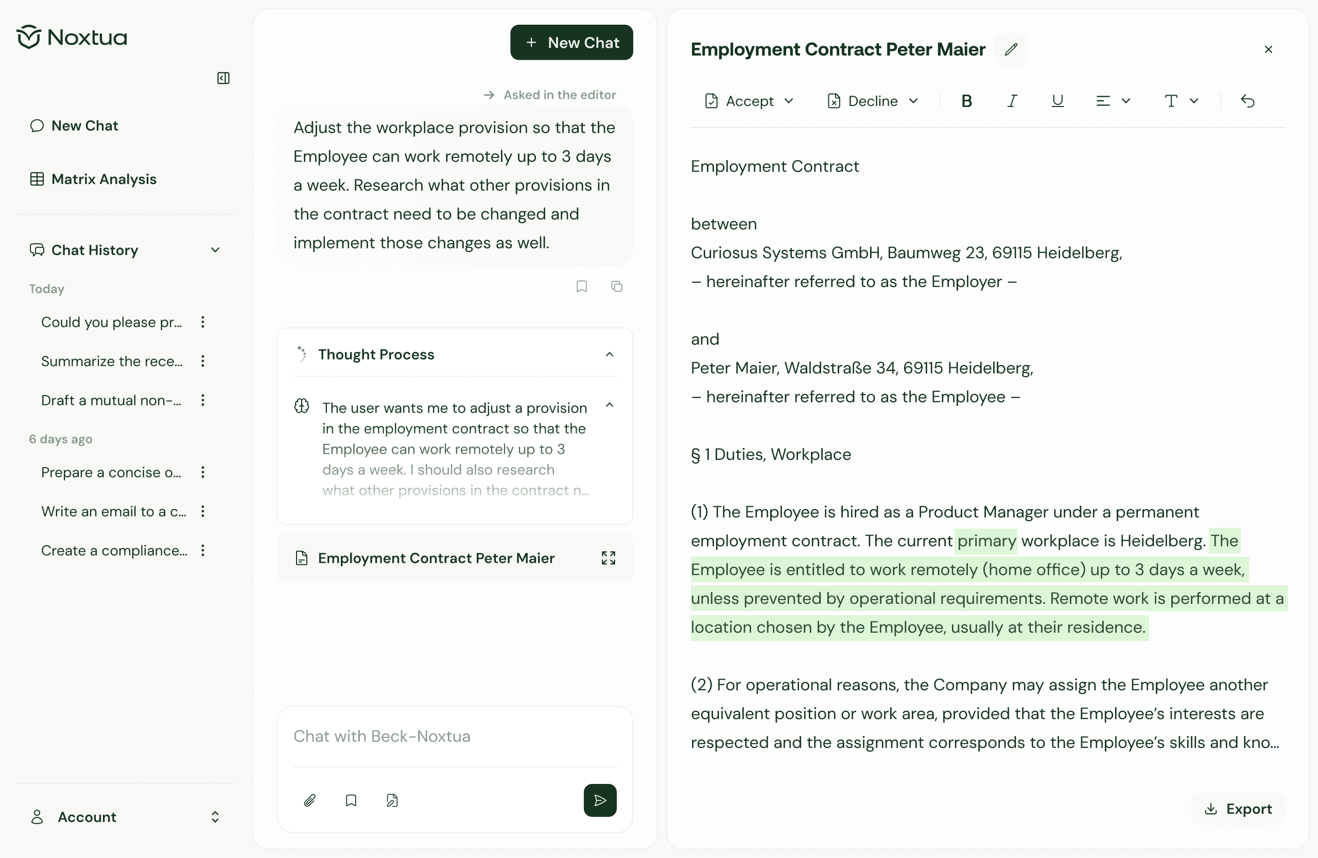 After receiving all relevant information, open the Editor. Instruct Beck-Noxtua in the chat to create a structured memorandum based on your research results. The AI analyzes the previous research and creates an initial draft in the Editor.