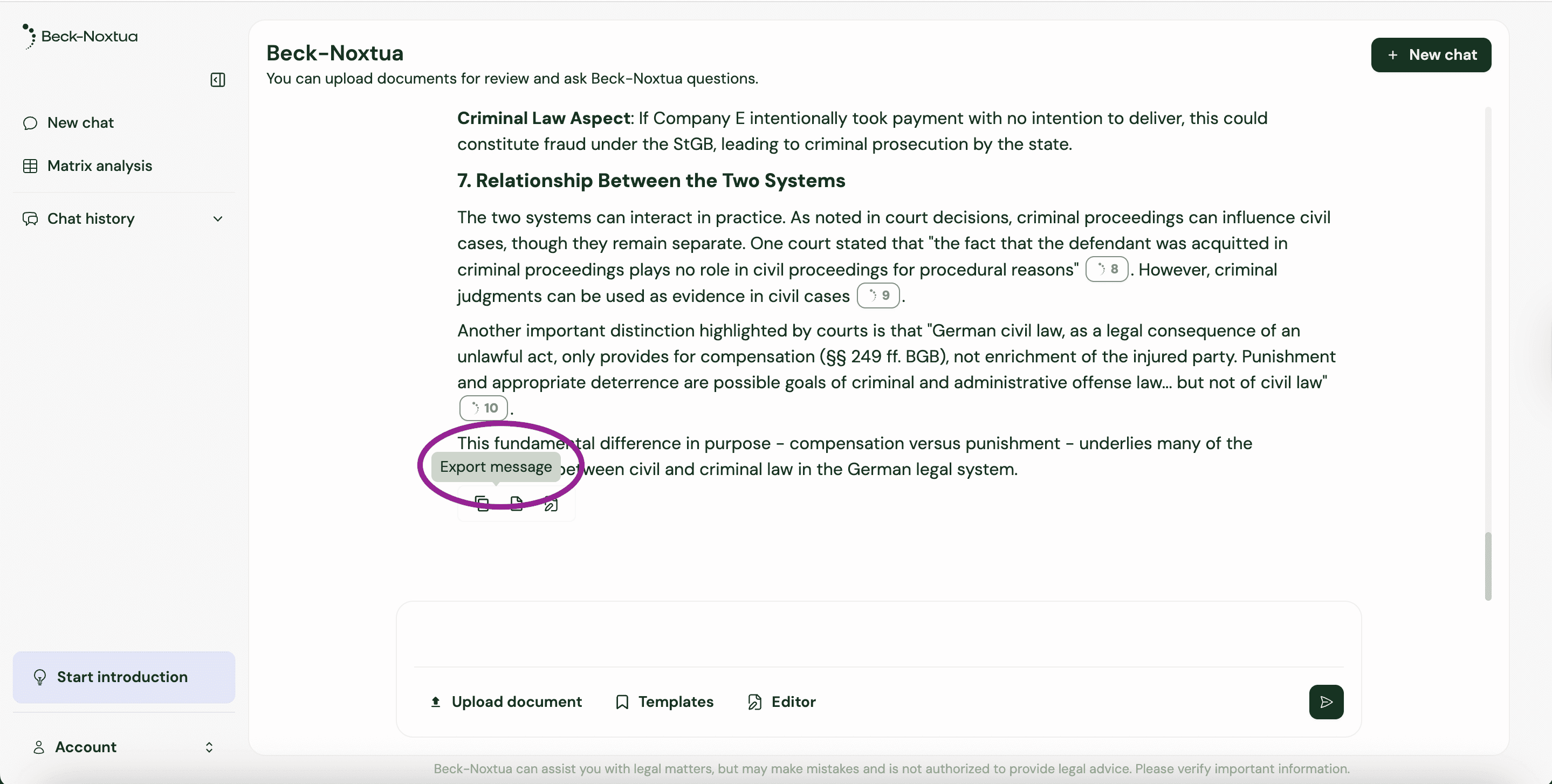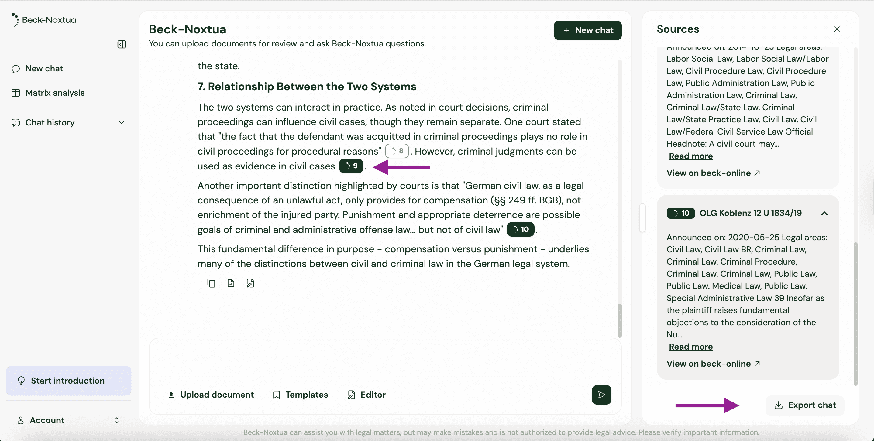 In Beck‑Noxtua you have the ability to upload documents into your chats and export generated results and full conversations. That gives you the flexibility to reuse content directly, document your work, or share it with colleagues.
