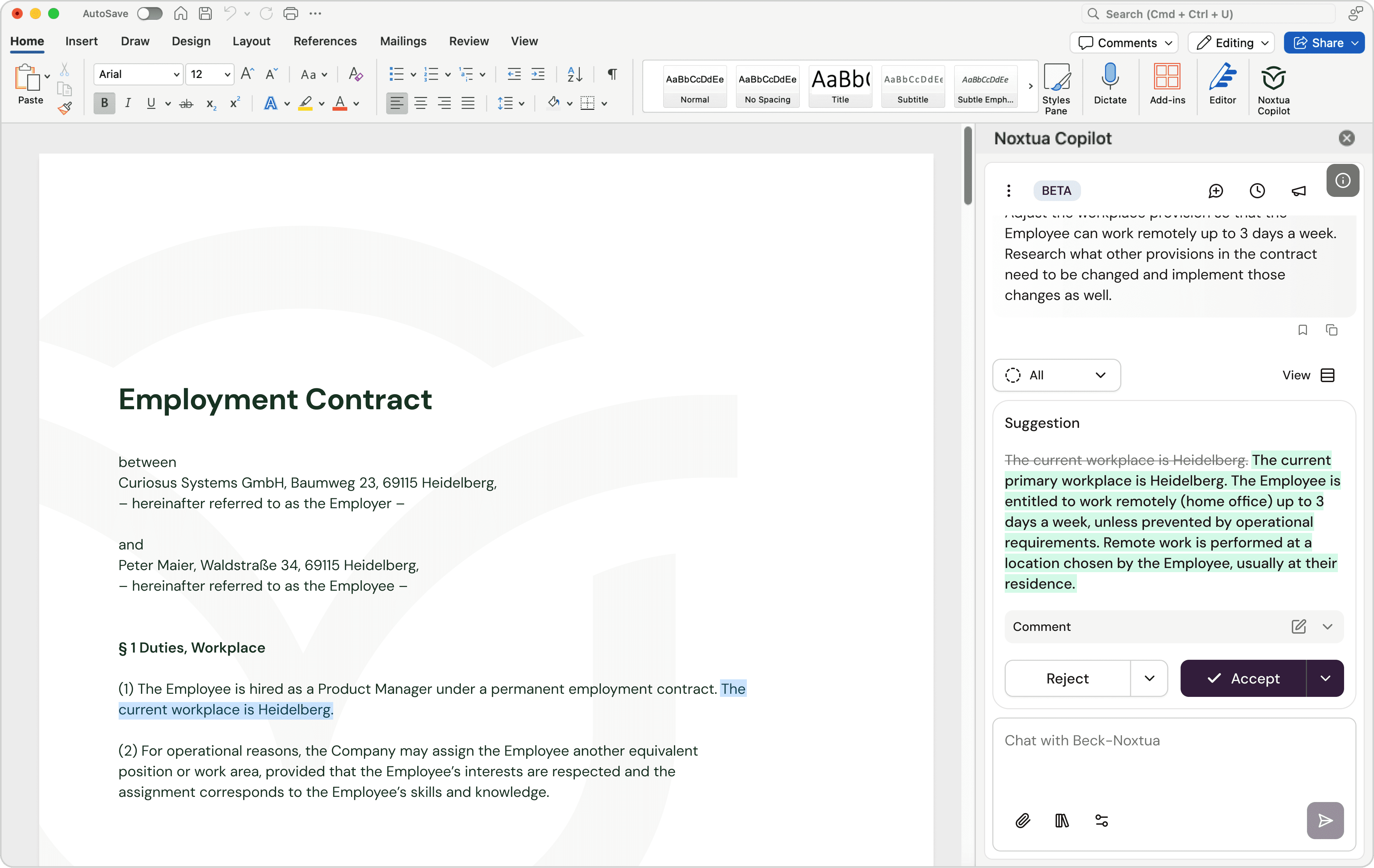 Noxtua's Word Add-in eliminates this friction, allowing you to make targeted improvements to existing documents and research legal issues collaboratively with Noxtua's AI – without leaving Word.
