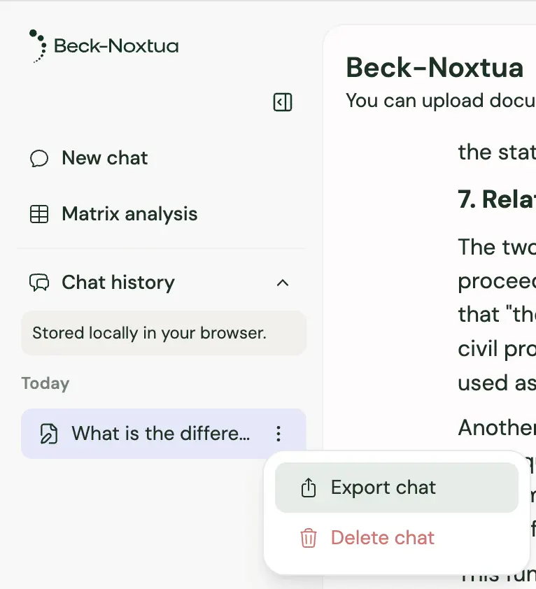 In Beck‑Noxtua you have the ability to upload documents into your chats and export generated results and full conversations. That gives you the flexibility to reuse content directly, document your work, or share it with colleagues.